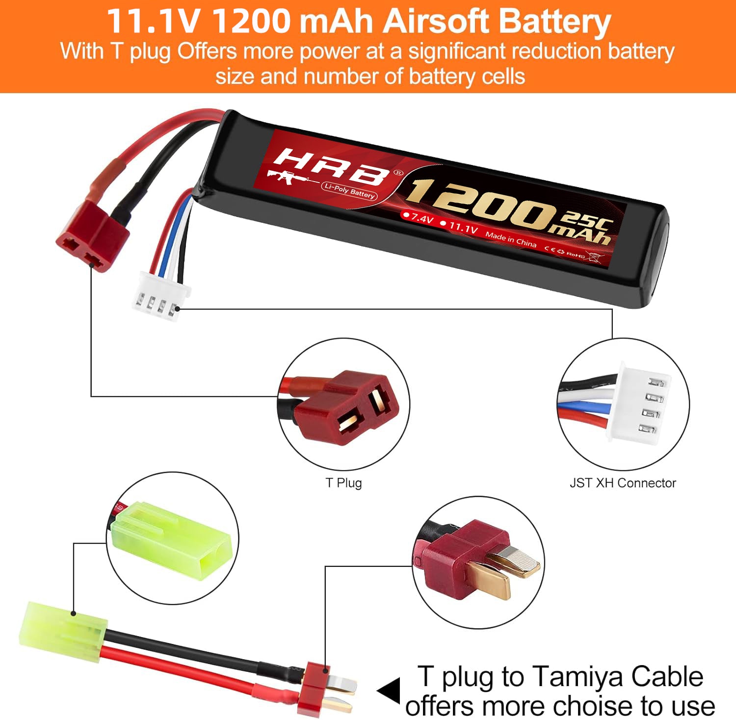 Airsoft Battery 7.4V 11.1V Rechargeable 3S LiPo 1200mAh 20C Split Pack Battery with Deans T Plug to Mini Tamiya Cable for Airsoft Model Guns